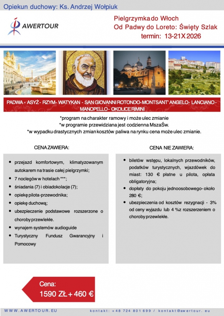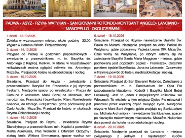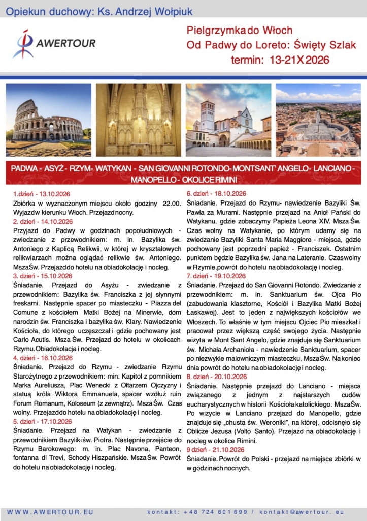 Nasza Parafia we współpracy z Biurem AWERTOUR organizuje pielgrzymkę do Włoch w dniach 13 do 21 października 2026 r.